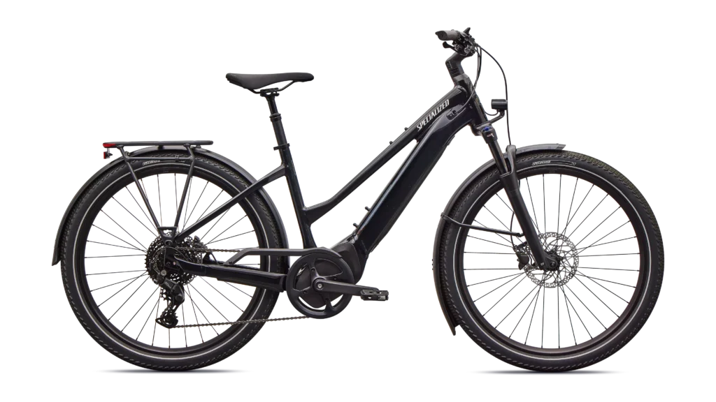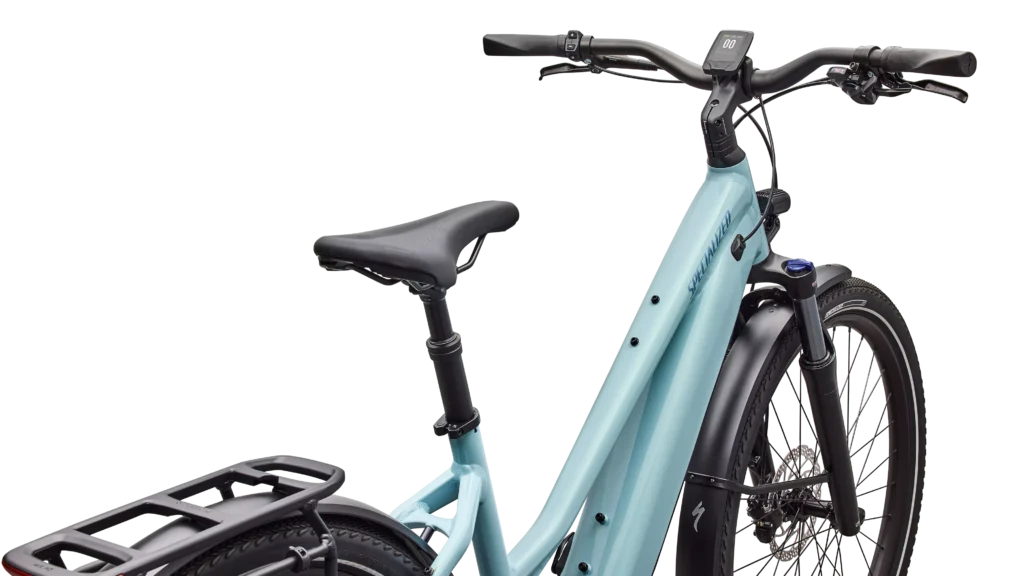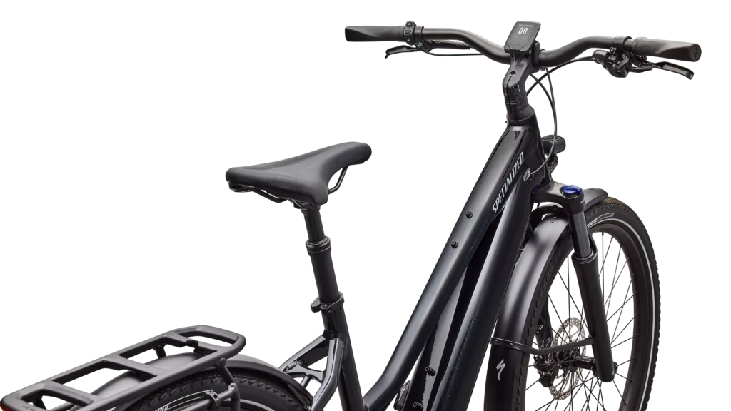 E5 Aluminum, mid-drive motor, fully integrated & lockable downtube battery, internal cable routing, wheel lock mount, and front rack compatible